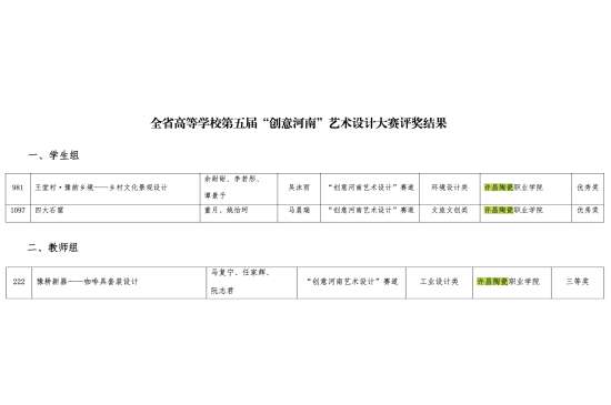 近日,全省高等学校第五届“创意河南”艺术设计大赛评选结果公示,我校陶瓷艺术与智能建造学院师生凭借精湛...