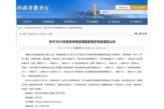 近日,中共河南省委教育工委、河南省教育厅2025年度优秀思政课程资源征集评选结果正式公布。根据中共河南省...