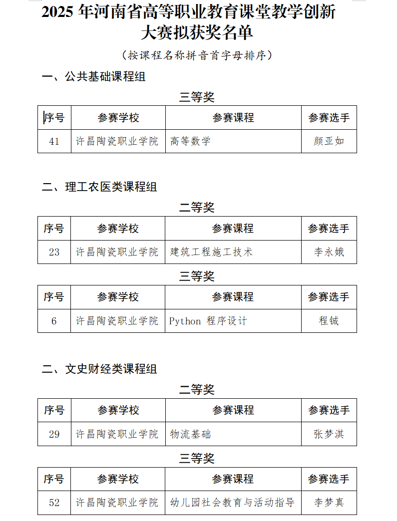 近日,河南省教育厅公布了2025年河南高等职业课堂教学创新大赛获奖名单的公示,我校参赛教师凭借扎实的教学功底、创新的教学设计与精彩的现场展示脱颖而出,在多个课程类别中脱颖而出,最终斩获二等奖2项、三等奖3项。充分彰显了学校教师队伍过硬的教学能力与育人水平。