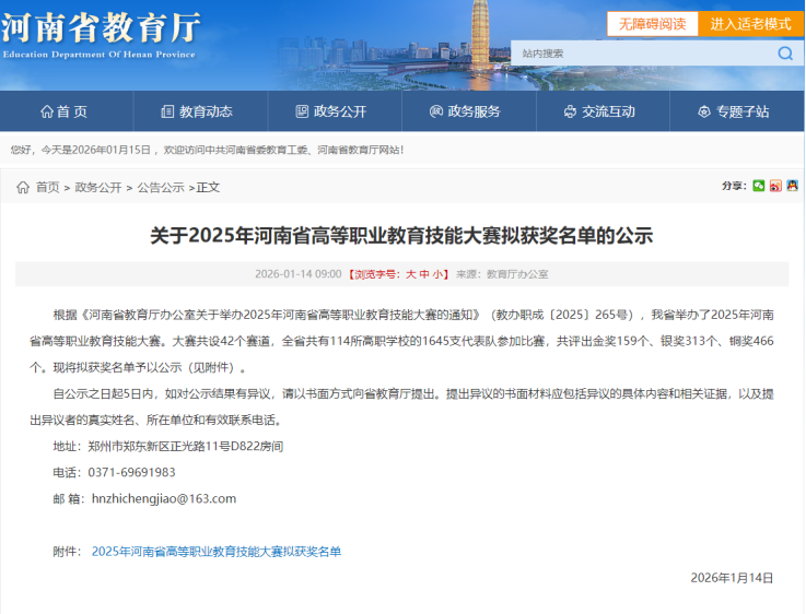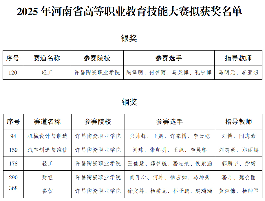 近日,河南省教育厅公布《2025年河南省高等职业教育技能大赛拟获奖名单》,我校参赛团队不负众望、奋勇拼搏,最终斩获银奖1项、铜奖5项,以精湛技能赢得荣誉,充分展现了学校高职教育的扎实育人成效。
