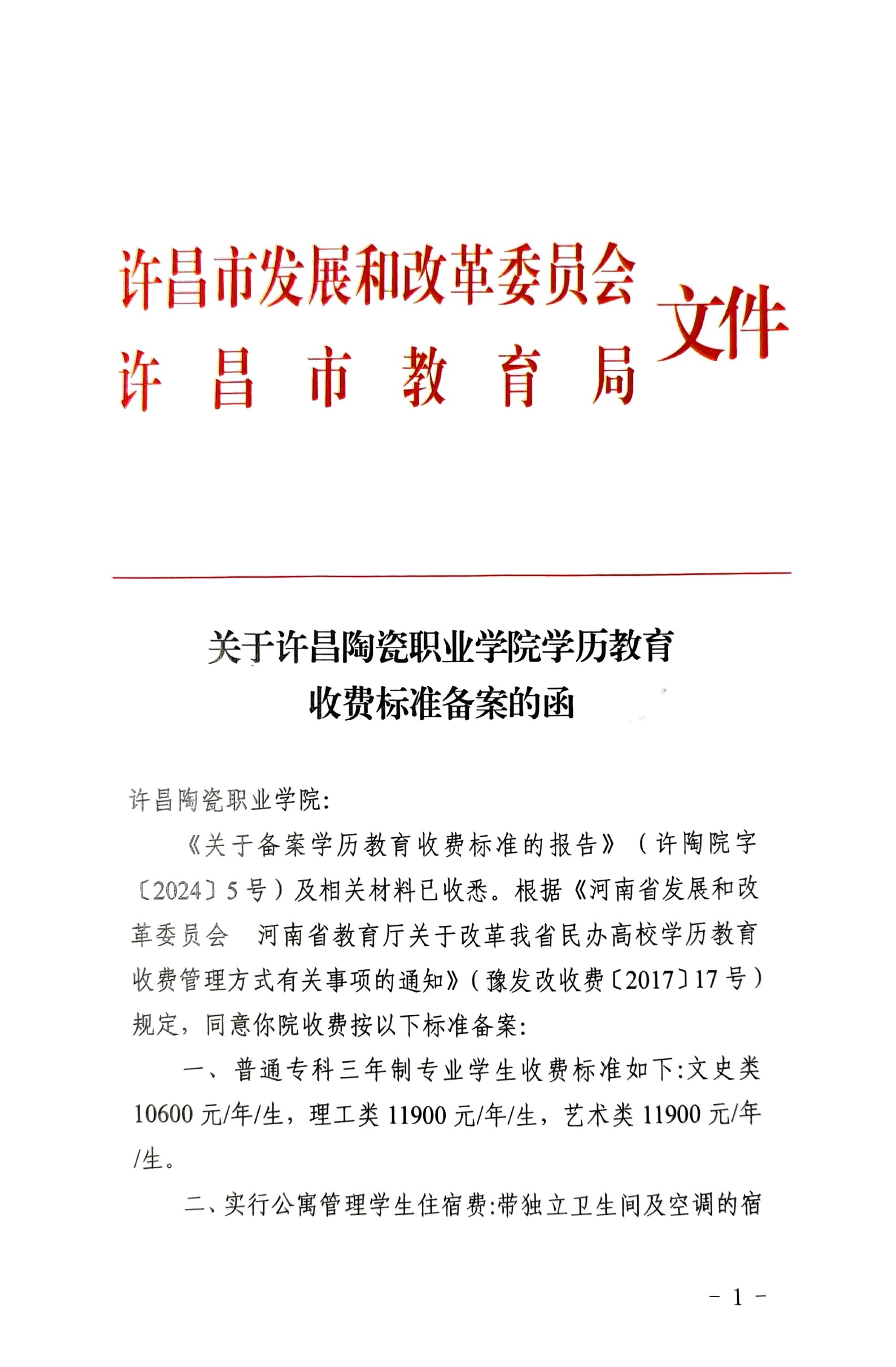 关于许昌陶瓷职业学院学历教育收费标准备案的函