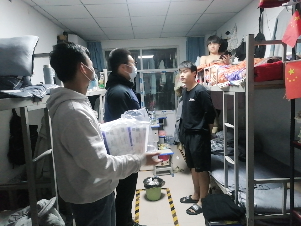 2022年5月11日晚,信息与机电工程学院学管秘书向玉坤同辅导员代表姬鹏飞、司志超、岳春雷、赵睿,教师代表郭文飞、韩留洋共同走访学生宿舍为同学们发放口罩并关心同学们的学习和生活情况。向玉坤亲切询问同学们在宿舍生活、学习情况、身心健康等方面的情况,对同学们在疫情期间坚持线上学习表示赞赏,并重点了解当前线上课堂的学习开展情况,网络教学的教学质量以及同学们对网络教学的反馈。