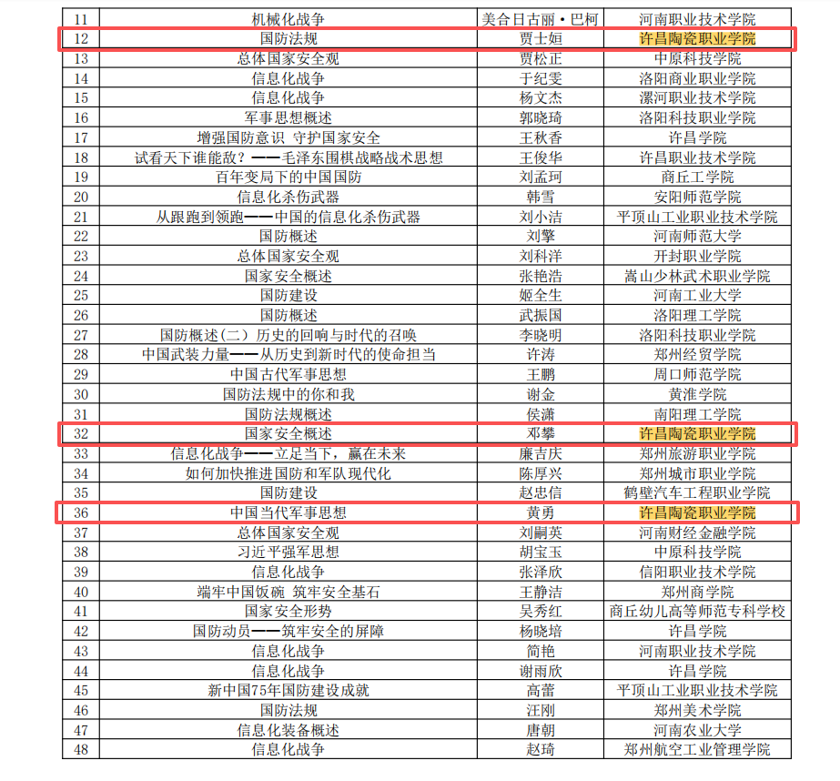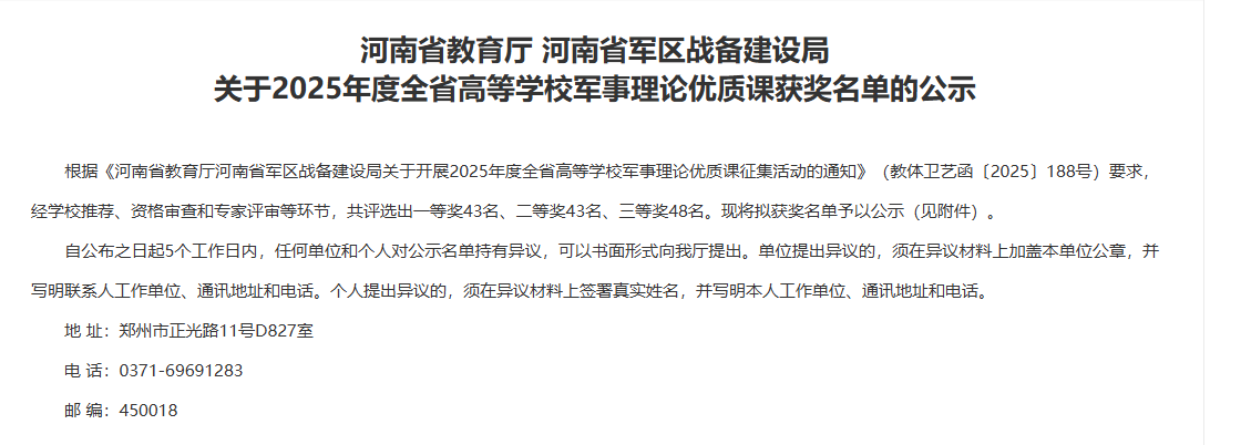 近日,河南省教育厅与河南省军区战备建设局联合发布了2025年度全省高等学校军事理论优质课获奖名单,马克思主义学院两位教师在本次评选活动中表现出色,荣获三等奖,展现了学院在军事理论教学方面的卓越实力。