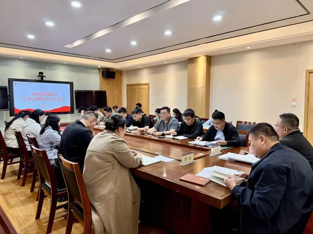 国庆假期将至,为切实保障学生假期人身财产安全,全面做好假期前后学生管理工作,有效防范各类安全事故发生,近日,我校在综合楼111会议室召开国庆假期前后学生管理安全工作会议。党委委员、副院长王中亚,纪委书记、工会主席郭磊,党委学生工作部部长、学生处处长雎小稳,学生处副处长王可喜,各二级学院学生管理负责人及辅导员代表共同参会,会议由雎小稳处长主持。
