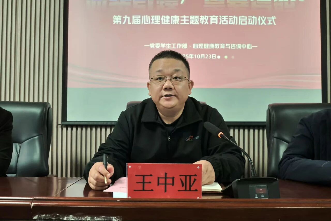 为深入学习贯彻党的二十届三中全会精神,贯彻落实习近平总书记关于加强学生心理健康教育工作的重要指示批示精神,进一步提升我校心理育人实效,增强师生心理健康意识,营造积极向上的校园心理文化氛围,10月23日上午,我校举行了第九届大学生心理健康主题教育活动启动仪式。学校党委委员、副院长王中亚出席活动仪式,党委学生工作部部长、学生处处长雎小稳,学生处副处长王可喜,心理健康教育与咨询中心教师,各二级学院、五年制专科部心理专干及各班级心理委员和学生代表参加启动仪式。心理健康教育与咨询中心负责人李欢阳老师主持仪式。