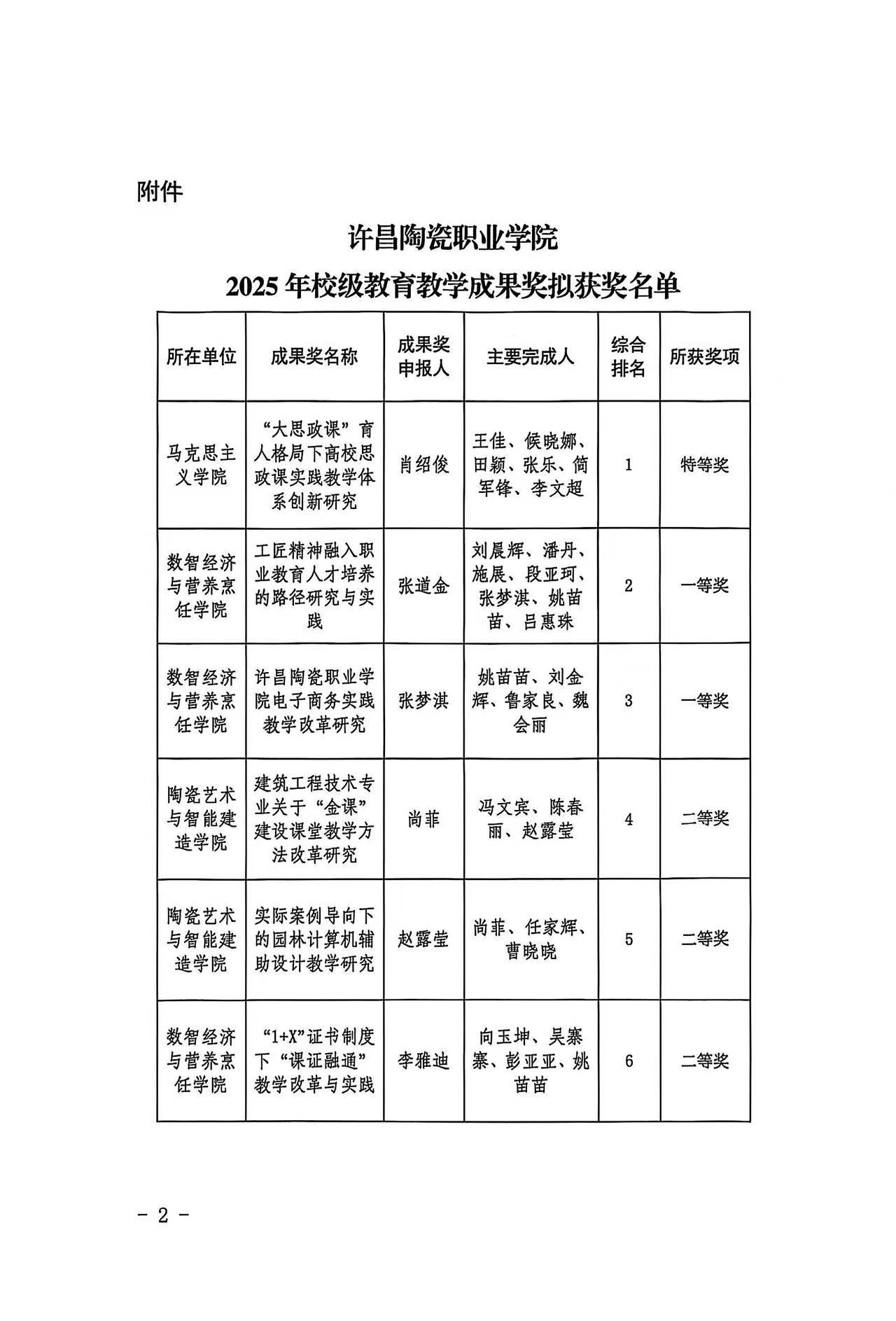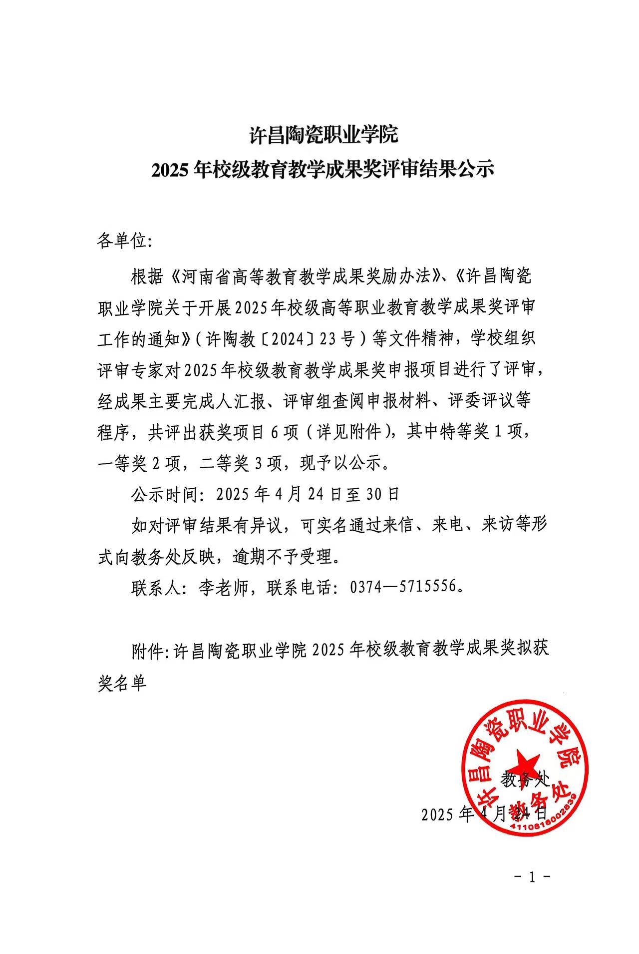 许昌陶瓷职业学院2025年校级教育教学成果奖评审结果公示