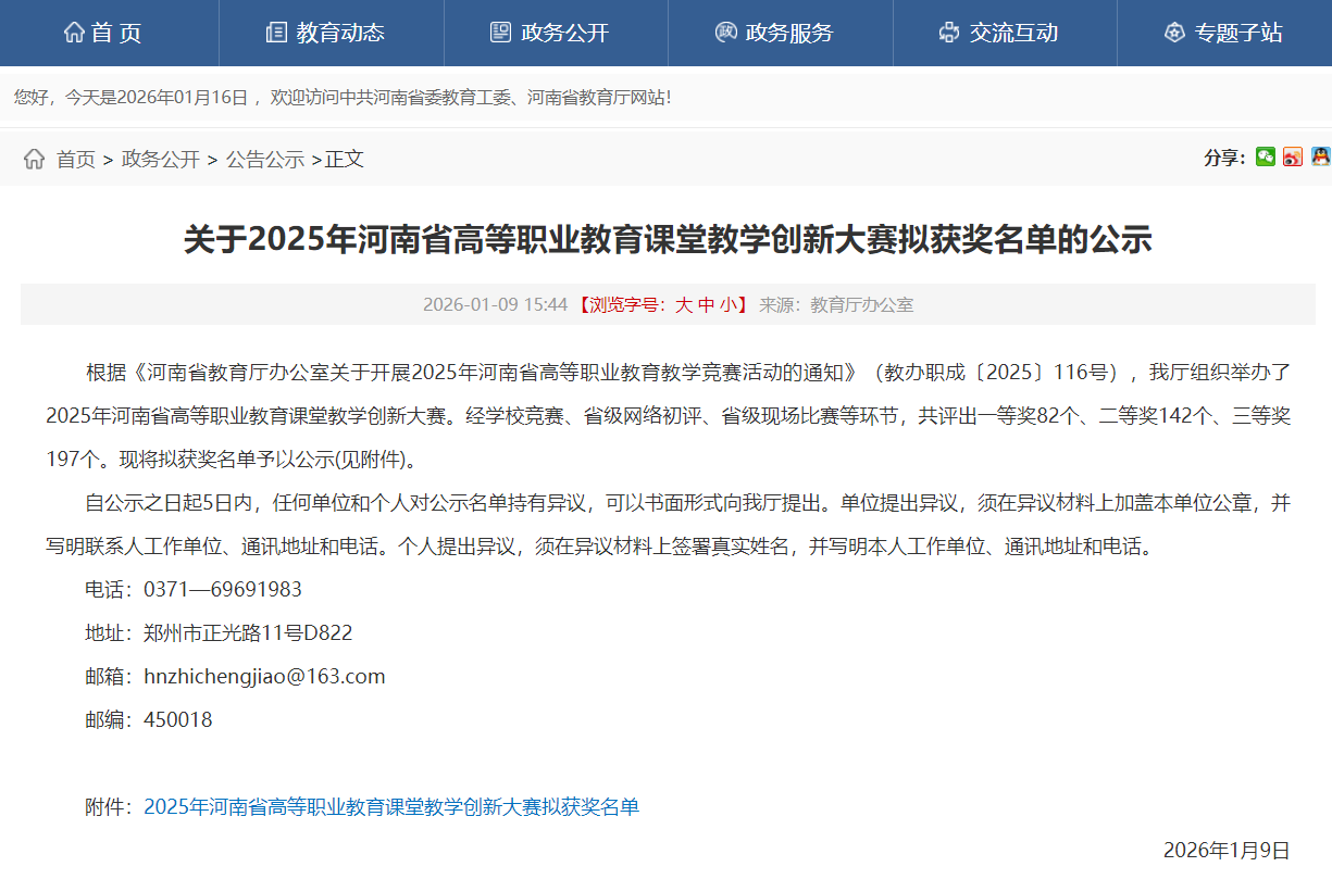 近日,河南省教育厅公布了2025年河南高等职业课堂教学创新大赛获奖名单的公示,我校参赛教师凭借扎实的教学功底、创新的教学设计与精彩的现场展示脱颖而出,在多个课程类别中脱颖而出,最终斩获二等奖2项、三等奖3项。充分彰显了学校教师队伍过硬的教学能力与育人水平。